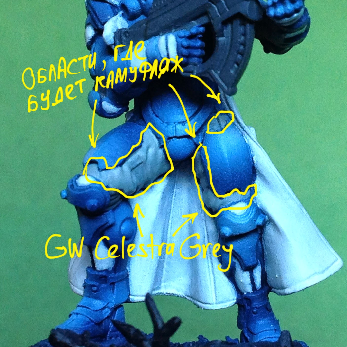 Области, где будет камуфляж, покрываем базовым слоем GW Celestra Grey (или любой светло-серый):
