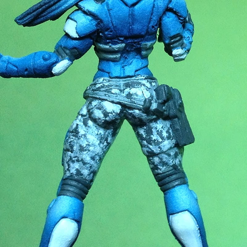 Проливка, помимо затемнения углублений, связывает предыдущие слои воедино. Стипплинг вдруг перестает выглядеть уродливо. Поверхность тонируется синим — и мы получаем из черно-белых предыдущих слоев наш стильный серо-синий камуфляж.